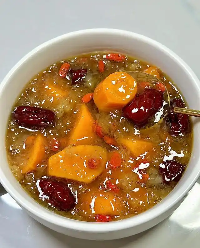 对于控糖或怕腻的女性来说,少糖养生版银耳羹是不错的选择。用红枣、苹果或雪梨自然提甜,大大减少了冰糖的用量,胶质依然浓稠,口感更加清润。将干银耳、红枣、苹果或雪梨切片,加水入锅,大火煮开转小火慢炖90分钟,苹果或梨自然出甜,让汤色更清亮。最后15分钟加入冰糖和枸杞,熄火后焖10分钟,让羹体更浓稠。汤羹透亮,银耳软糯拉丝,苹果或雪梨微甜果香,红枣枸杞点缀,喝着温润不腻,口感清新,补气血的同时还不用担心长胖。
