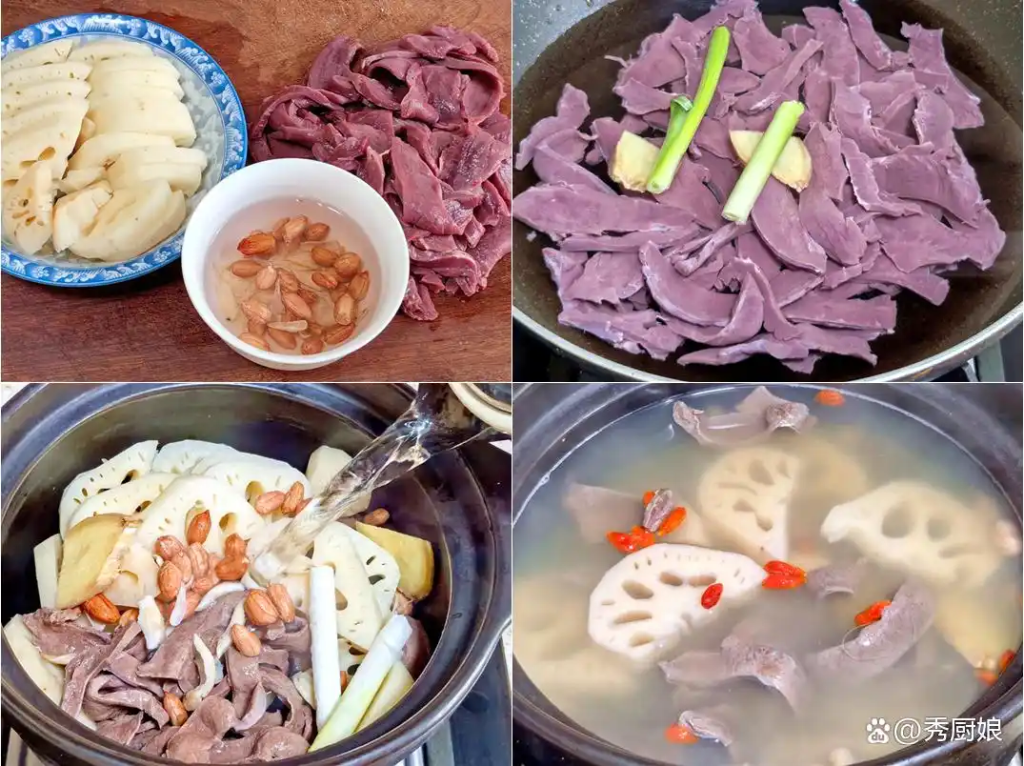 - 做法:猪心切片焯水,莲藕切块,花生和百合枸杞洗净。将所有材料放入锅中,加足水,大火烧开转小火慢炖 1 小时,出锅前加盐调味即可。