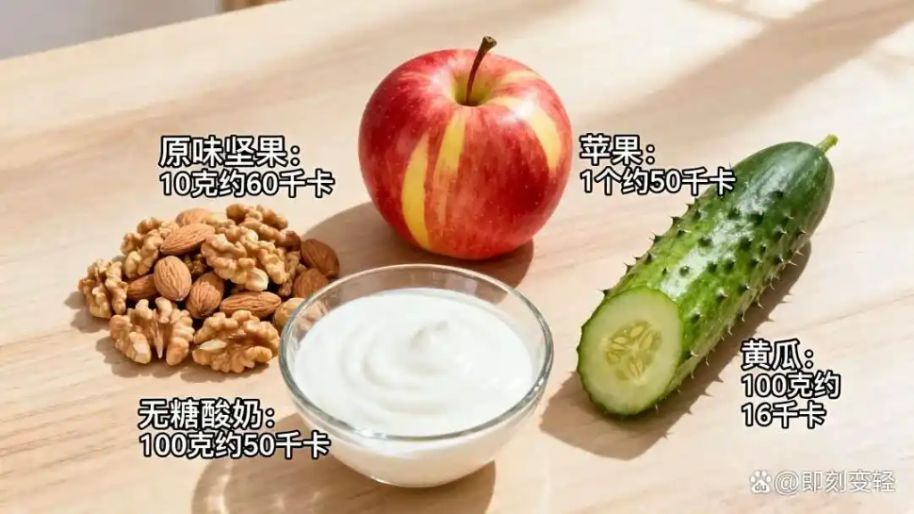 加餐是控制饮食的“缓冲带”,能有效避免因过度饥饿导致正餐暴饮暴食。上午10点、下午3 – 4点若感到饥饿,可选择低热量、高营养的食物,如1小把原味坚果(约10克,如杏仁、核桃)、1个中等大小的苹果或橙子、1盒无糖酸奶(100克),或者1根黄瓜、1小份圣女果。这些食物既能缓解饥饿感,又不会造成热量超标,是加餐的明智之选。